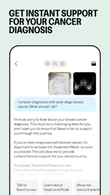 Om du skulle få en cancerdiagnos, blir Need en avgörande resurs. Appen stärker din läkare med tillgång till världsledande forskning och de senaste rönen inom cancerbehandling. Needs avancerade teknikplattform möjliggör för din vårdgivare att erbjuda den mest framstående behandlingen, oavsett var du befinner dig, med målet att uppnå bästa möjliga utfall. Och när behandlingen är avslutad, fortsätter vårt engagerade team att stödja dig genom återhämtningsfasen, så att du snabbt kan återgå till ditt vardagsliv.