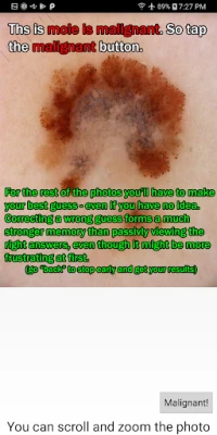 Med den unika funktionen att spara dina tidigare misstag, kan du enkelt återkomma och testa dig själv specifikt på de bilder där du tidigare gjorde fel. Detta garanterar att du får den upprepning och förstärkning som krävs för att verkligen bemästra klassificeringen av hudförändringar. Systemet guidar dig genom en skräddarsydd repetitionsprocess, vilket stärker din kompetens och ger dig ökad trygghet i dina bedömningar. Vare sig du är en student, en läkare eller bara intresserad av att öka din kunskap, är detta verktyg ovärderligt för att finslipa din förmåga att skilja mellan godartade och maligna bilder, gång på gång.
